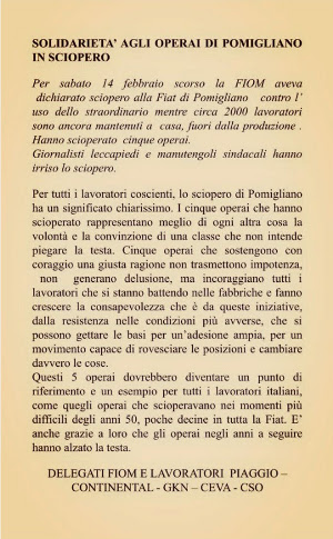 Per sabato 14 febbraio scorso la FIOM aveva dichiarato sciopero alla Fiat di Pomigliano contro l'uso dello straordinario mentre circa 2000 lavoratori sono ancora mantenuti a casa, fuori dalla produzione. Hanno scioperato cinque operai.