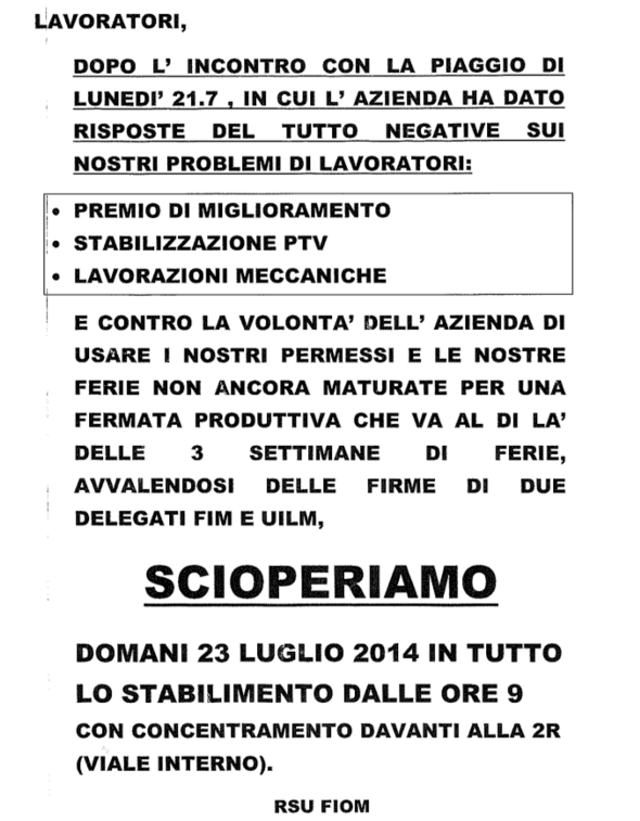 Soprattutto però ora a farli infuriare è quell'accordo sulle vacanze, firmato da Fim, Uim e Ugl che mette le ferie e i permessi del lavoratore a disposizione dell'azienda per fare le fermate produttive visto che la cassaintegrazione, essendo Piaggio in regime di solidarietà, non può essere attivata.